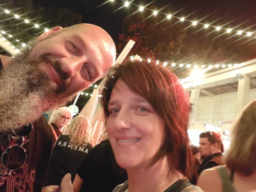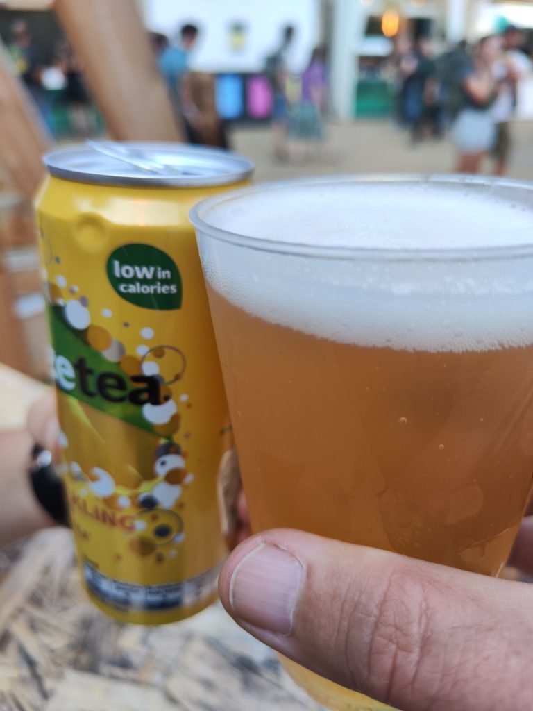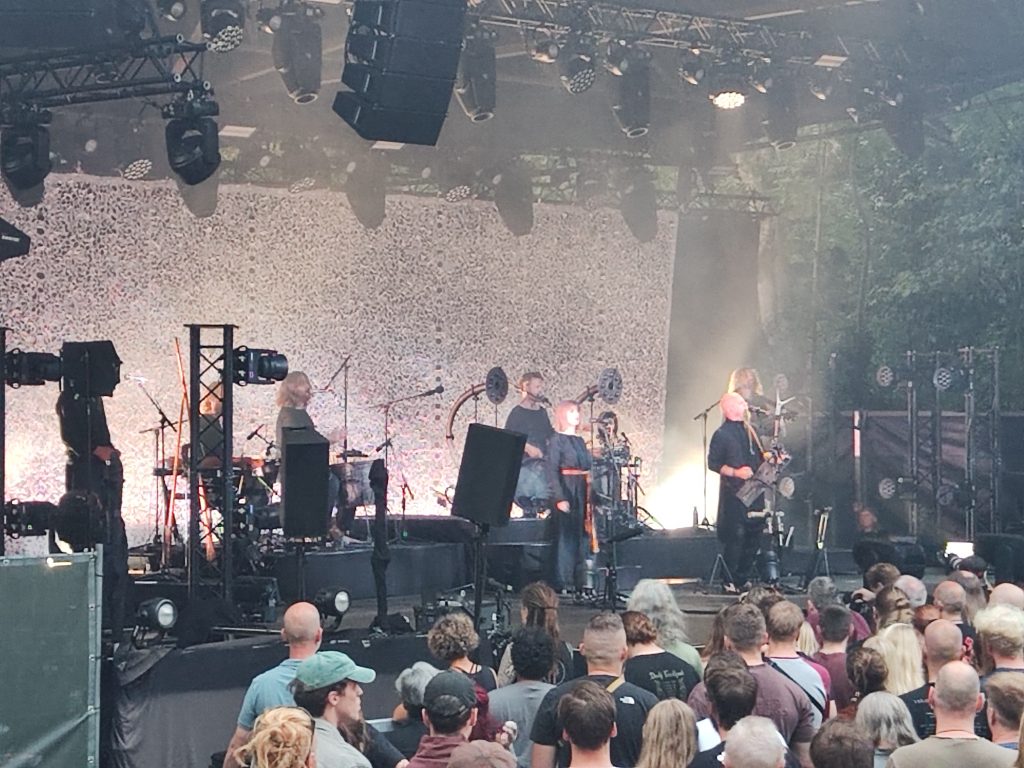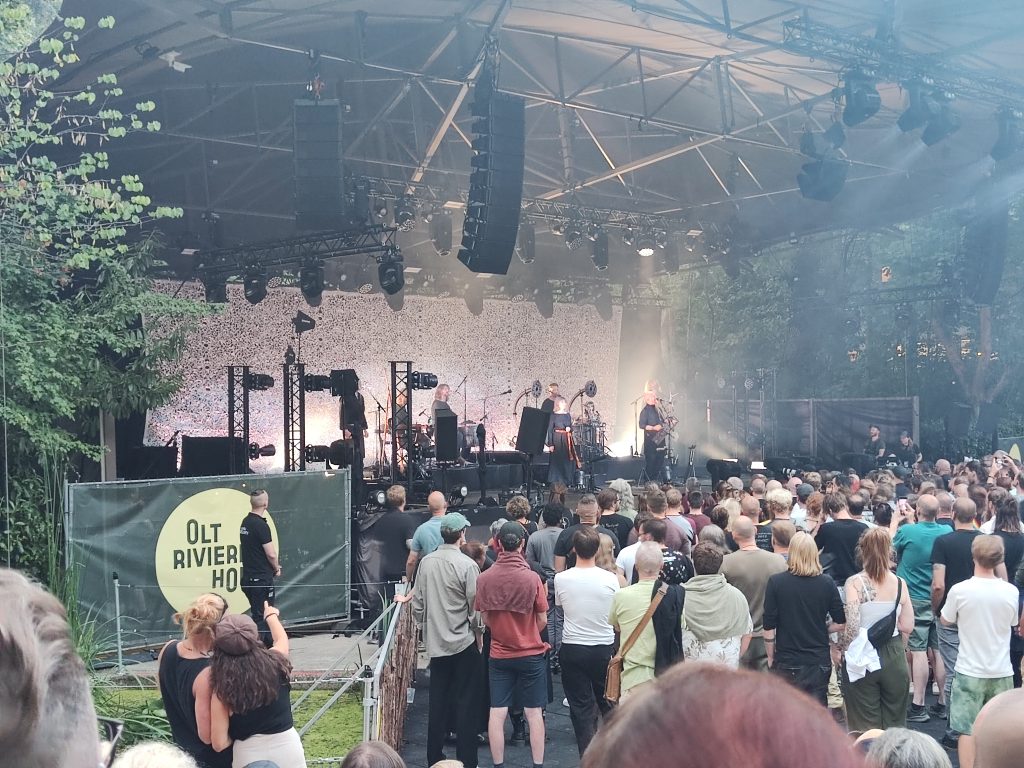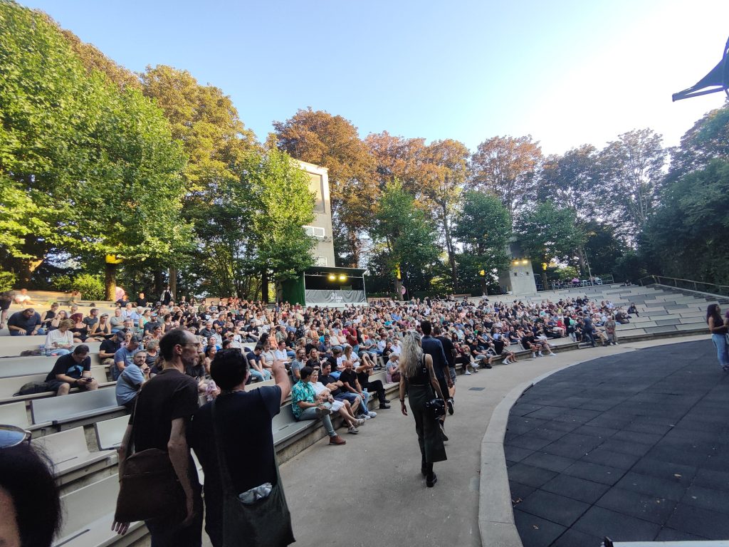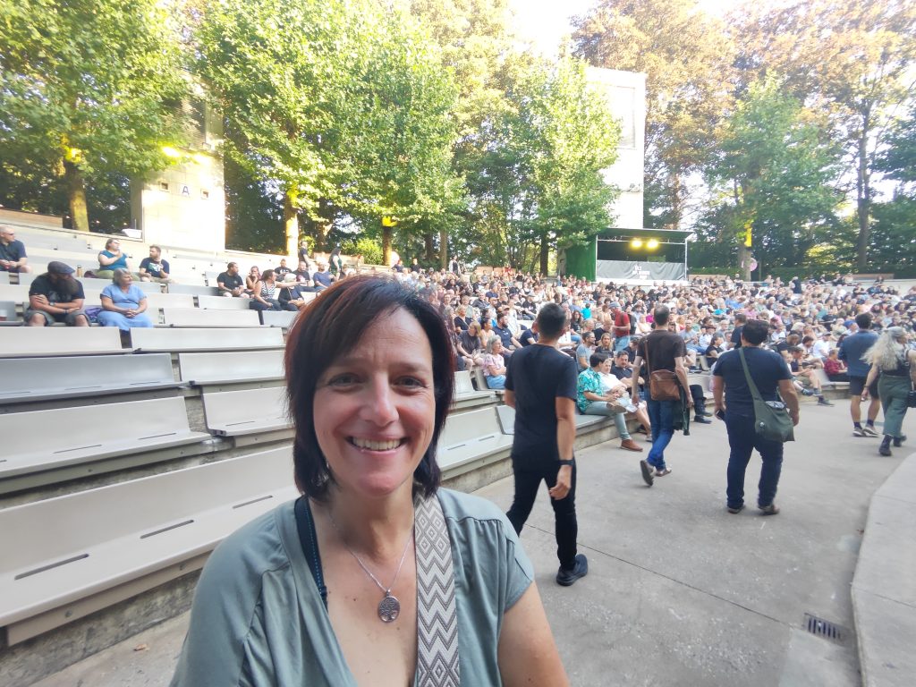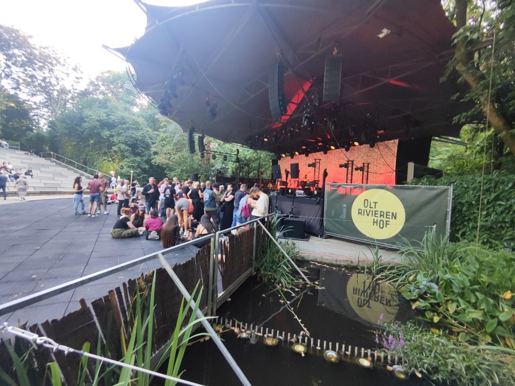 Durch Antwerpen führt ein dichtes Netz von „Fahrradautobahnen“, echt spannend hier mit dem Handy als Navi quer durch die Stadt zu gondeln. Nach etwa 30 Minuten erreichen wir die Provinzdomäne Rivierenhof, eine Art großer Stadtpark. Hier findet das Konzert auf einer Freilichtbühne statt. Wir warten noch auf den Einlass, dann geht’s rein, zu Beginn ein Rondell mit Getränke- und Essensstationen. Also erst einmal etwas gegen Hunger und Durst tun.