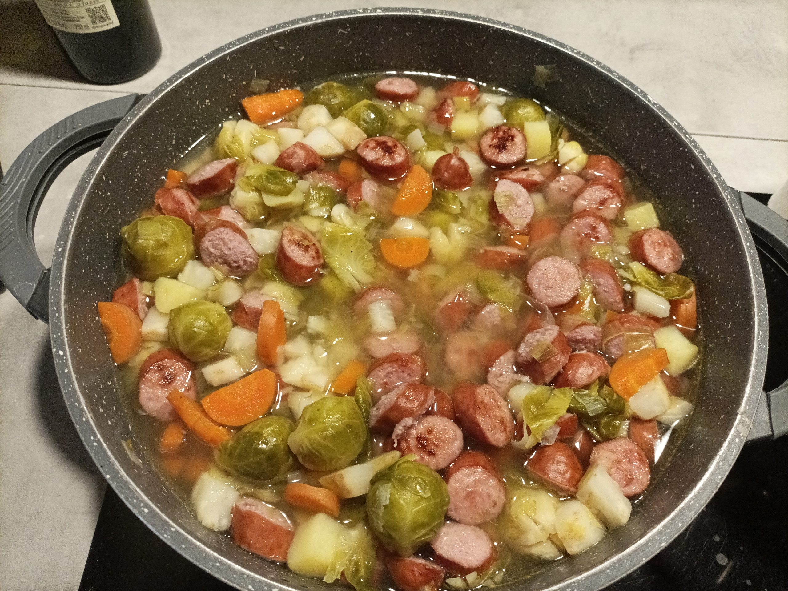 Wenn das Gemüse fast gar ist, die gebratenen Wurstscheiben mit in die Suppe geben und mitziehen lassen. Danach mit Pfeffer und salz abschmecken.